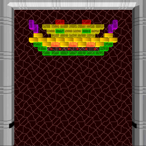 That’s it. Just a few simple lines of text. Any line that does not start with “#” is interpreted as a row of the playfield, and the characters in that row represent the blocks to be created. In this map, we have ‘V’ for violet, ‘R’ for red, ‘Y’ for yellow, ‘G’ for green, ‘D’ for gold, ‘$’ for deadly plasma, and ‘@’ for the boss target blocks. A ‘-‘ dash modifies the preceding character to create a horizontal block, and a ‘|’ vertical bar modifies the above character to create a vertical block. If neither modifier is used, a small cubic block is created.